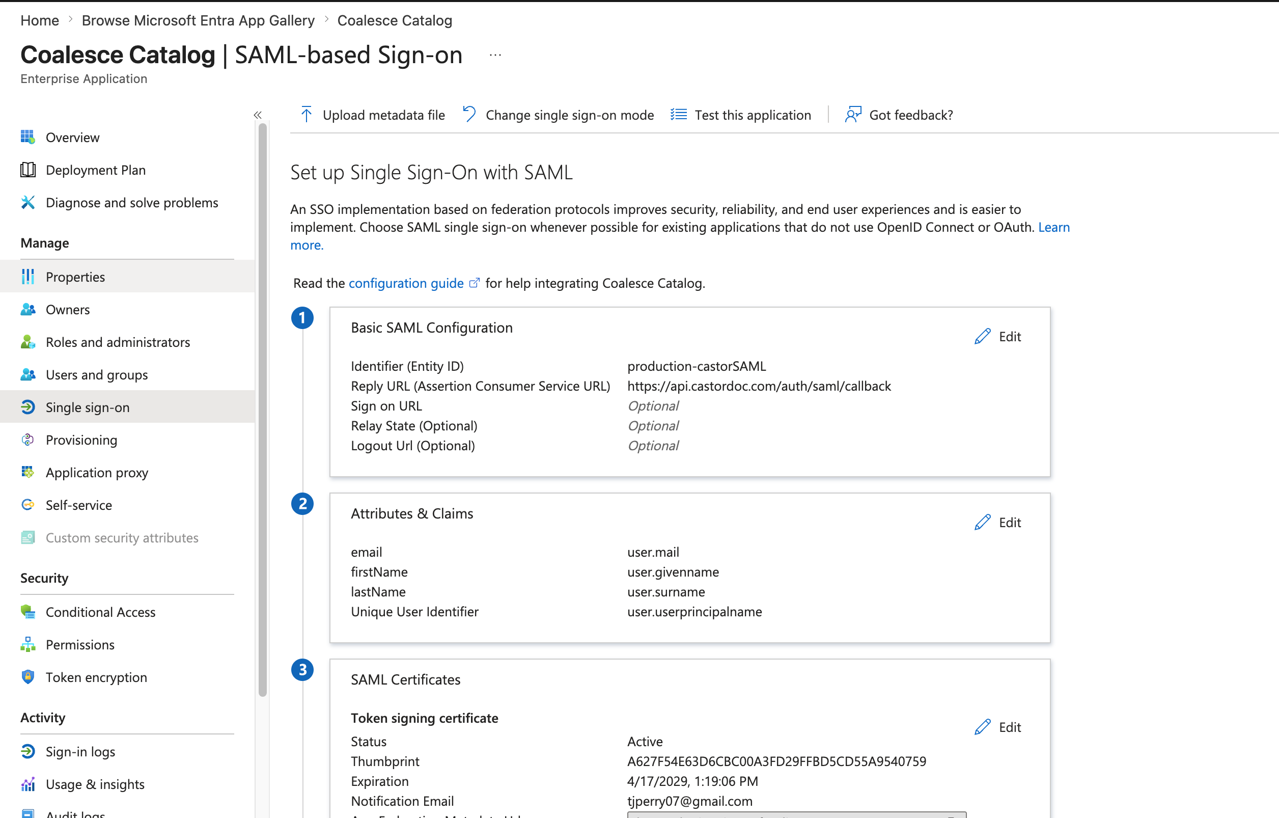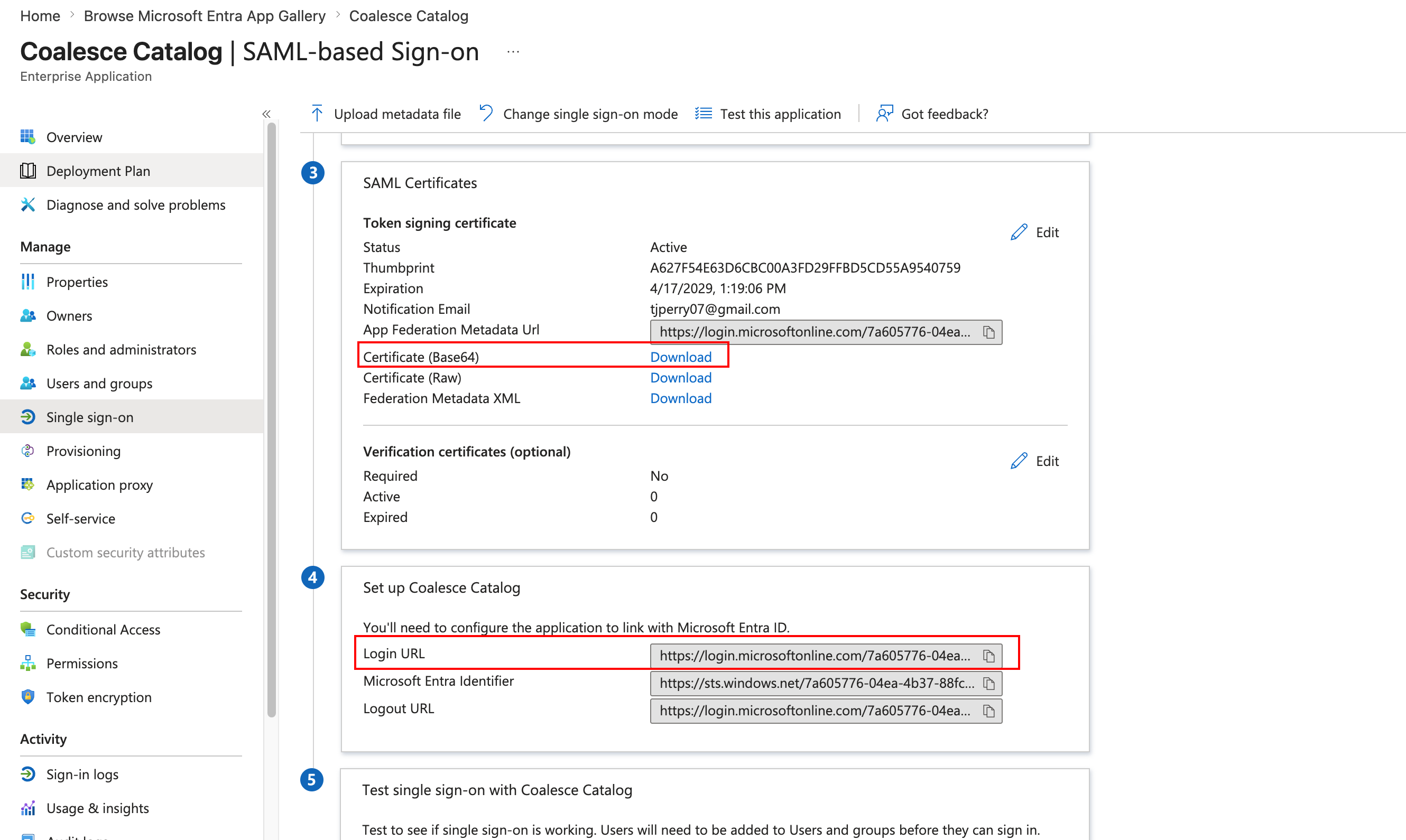 Paste the signing certificate and login URL from Microsoft Entra into Catalog so SAML sign-in can complete.