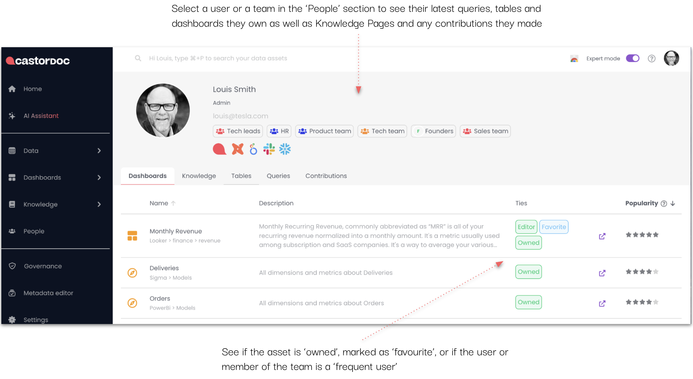 Use the people or teams page if you know who is using the asset you are looking for: see what they own, frequent queries, tables for which they are frequent users and knowledge or asset contributions.